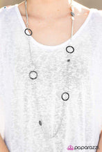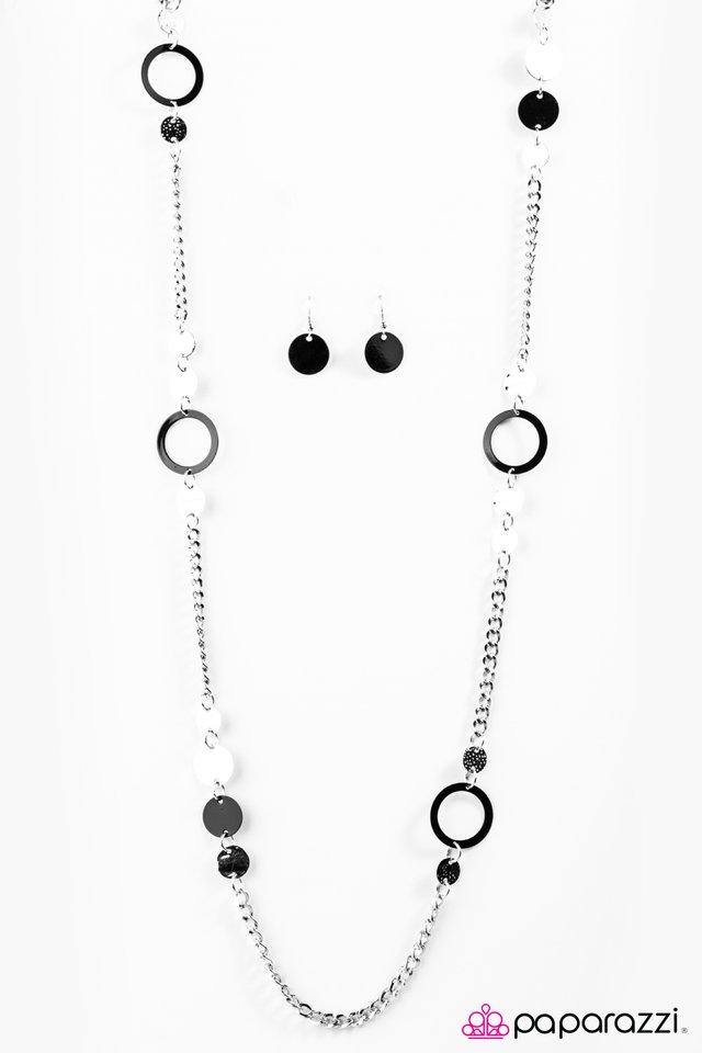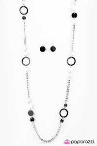 Textured and smooth silver discs join shiny black accents along an elongated silver chain, creating a whimsical palette. Features an adjustable clasp closure.