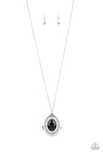 Encircled in rings of glassy white rhinestones, an oversized black gem is pressed into the center of a glistening silver frame, creating a glamorous pendant at the bottom of a lengthened silver chain. Features an adjustable clasp closure.
