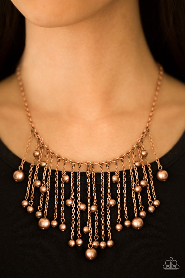 Varying in length, glistening copper chains swing from the bottom of a bold copper chain. Pearly copper beads trickle down the chains, creating a fierce fringe below the collar. Features an adjustable clasp closure.