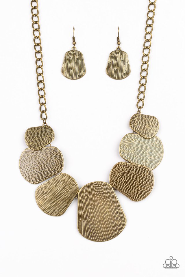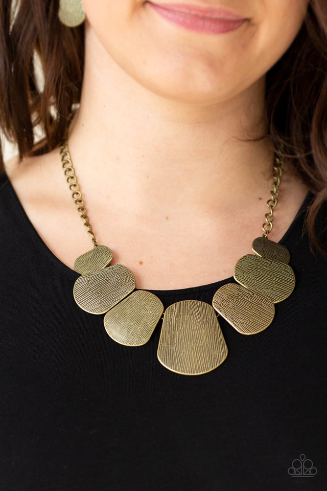 Embossed in glistening linear textures, shimmery brass plates connect below the collar, creating a fierce fringe. Features an adjustable clasp closure.