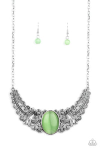 Featuring vine and floral details, leafy silver frames branch out from an oversized green cat's eye stone center, creating a dramatically whimsical centerpiece below the collar. Features an adjustable clasp closure.