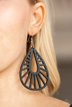 Brushed in a shiny black finish, an ornate wooden teardrop swings from the ear for a seasonal look. Earring attaches to a standard fishhook fitting.