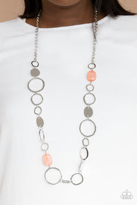 Infused with glassy coral accents, a shiny series of asymmetrical hoops and discs delicately link across the chest for a flirty pop of color. Features an adjustable clasp closure.