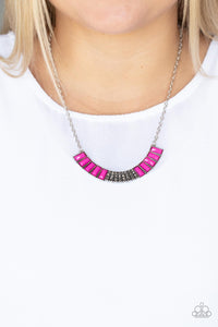 Stacked rows of hematite rhinestones and faceted emerald cut Fuchsia Fedora beads coalesce into a colorful half moon pendant, creating a vivacious pop of color below the collar. Features an adjustable clasp closure.