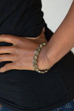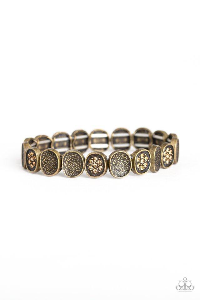 An array of textured and golden topaz encrusted brass frames are threaded along a stretchy band around the wrist for a dainty look.