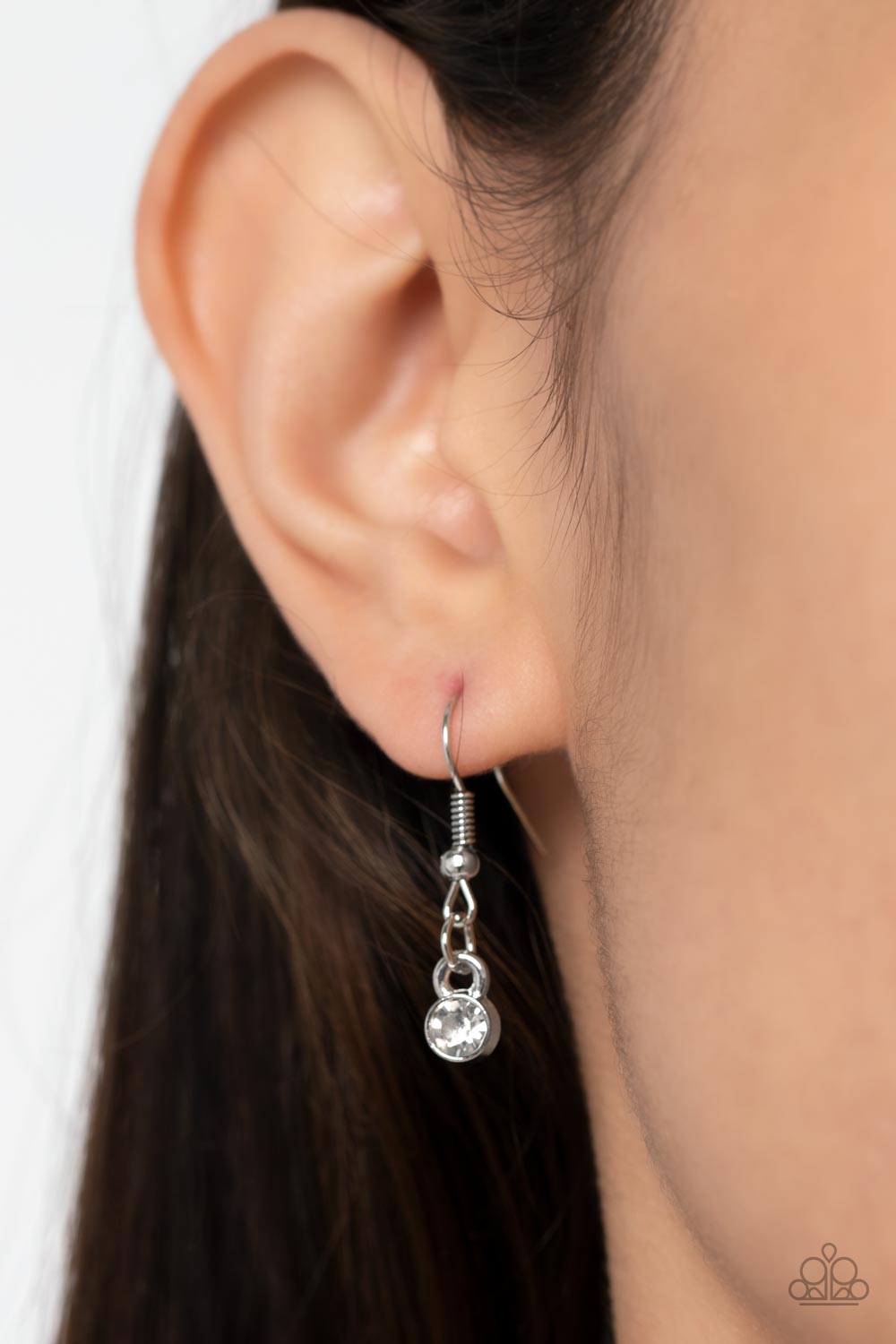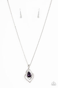 Plain silver and white rhinestone encrusted silver bars asymmetrically swoop and swirl around an oversized purple teardrop gem, creating a dazzling pendant at the bottom of a lengthened silver chain. Features an adjustable clasp closure.