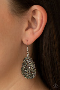 Featuring studded silver fittings, a smoldering collection of smoky and hematite rhinestones coalesce into a dazzling teardrop frame. Earring attaches to a standard fishhook fitting.