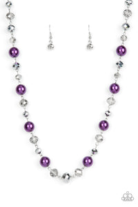 A glamorous collection of oversized pearly purple beads, metallic-flecked and smoky crystal-like beads delicately link below the collar, resulting in a glitzy pop of color. Features an adjustable clasp closure.