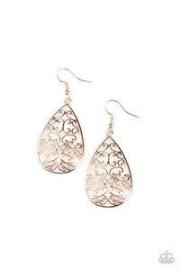 Vine-like filigree climbs the center of a shiny rose gold teardrop, creating a whimsical frame. Earring attaches to a standard fishhook fitting.