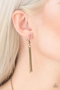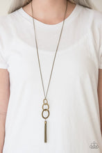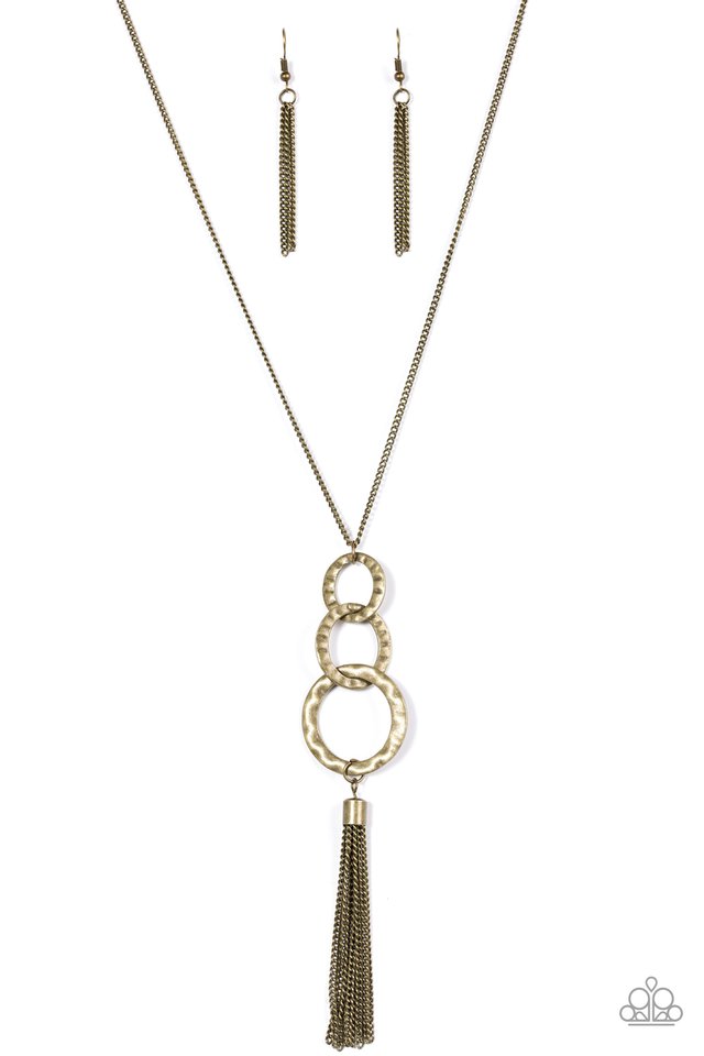 Delicately hammered in glistening textures, shimmery brass hoops swing from the bottom of a shiny brass chain, creating a bold industrial pendant. A shimmery brass tassel swings from the bottom of the stacked pendant for a seasonal finish. Features an adjustable clasp closure.