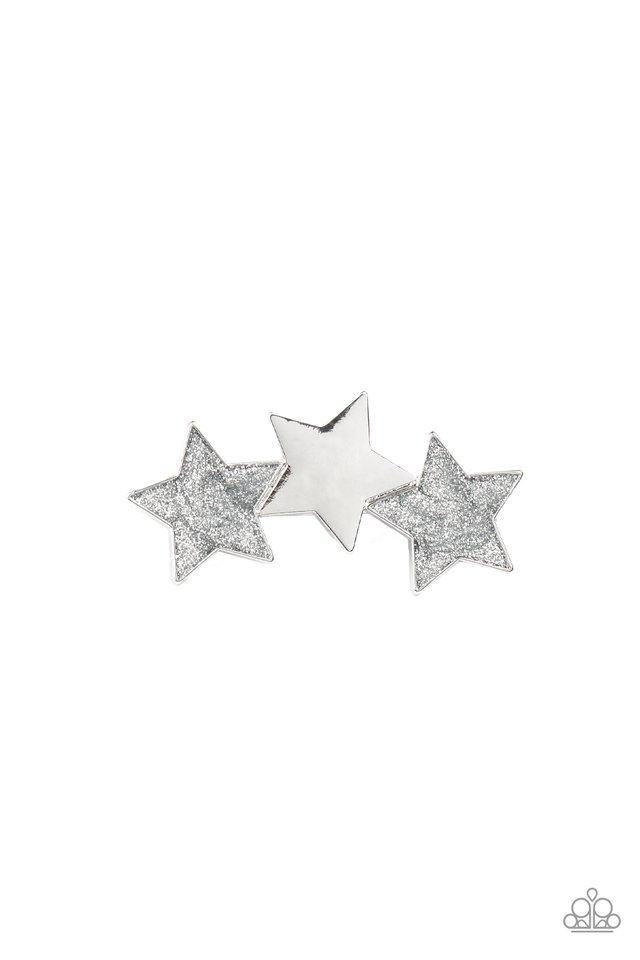 Painted in glittery silver sparkles, a sparkly pair of stars flanks a shiny silver star, coalescing into a stellar centerpiece. Features a standard hair clip.