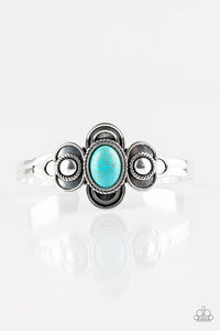 A refreshing turquoise stone is pressed into the center of a dainty silver cuff radiating with textured silver frames for a seasonal look.