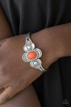 A refreshing orange stone is pressed into the center of a dainty silver cuff radiating with textured silver frames for a seasonal look.