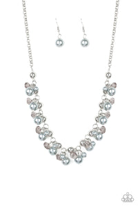 A refined collection of silver beads, silver pearls, and smoky crystal-like beads cluster below the collar, creating a timeless fringe. Features an adjustable clasp closure.