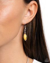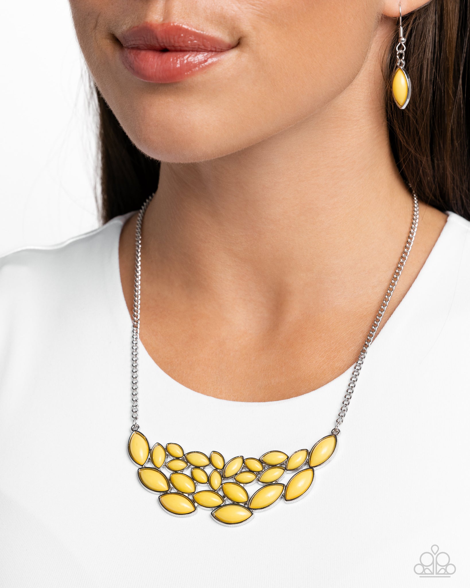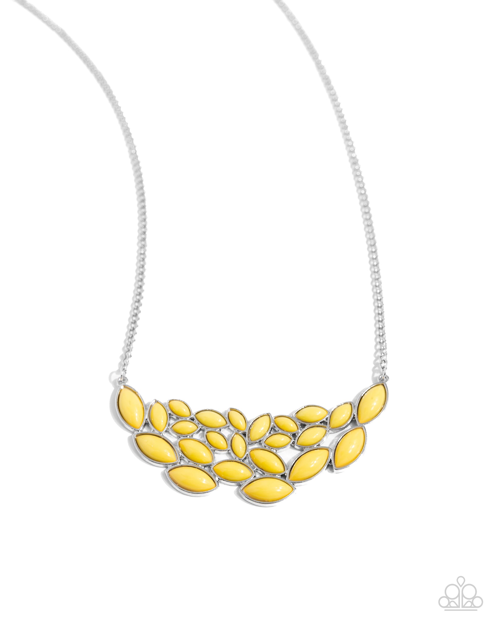 Encased in sleek silver frames, a collection of marquise shaped yellow beads delicately coalesce into a leafy pendant below the collar for a whimsical pop of color. Features an adjustable clasp closure.