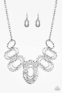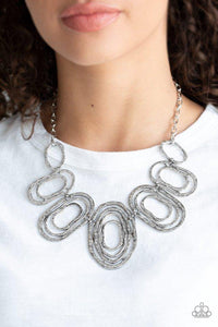 Delicately hammered in rippling textures, coiling silver rings connect below the collar. The shimmery frames gradually increase in size at the center for a statement-making finish. Features an adjustable clasp closure.