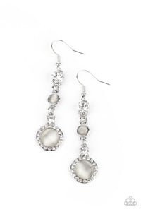 A glassy white rhinestone and white cat’s eye stone give way to a combination of two whimsical frames encircled in a ring of dainty white rhinestones, creating an elegant lure. Earring attaches to a standard fishhook fitting.