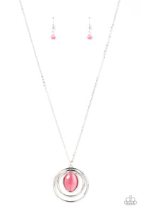 An oval pink cat's eye stone attaches to the top of silver rings that ripple out into a dizzying pendant at the bottom of an extended silver chain, resulting in a mystical pop of color. Features an adjustable clasp closure.