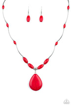 A collection of shiny silver beads and red stone beads are threaded along an invisible wire below the collar. A dramatically oversized red teardrop pendant swings from the bottom for a seasonal flair. Features an adjustable clasp closure.