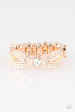 Encrusted in dainty white rhinestones, glistening rose gold ribbons loop away from a dazzling white rhinestone center for a refined look. Features a dainty stretchy band for a flexible fit.