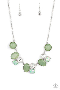 Opaque Basil beads in perfectly polished circles and faceted ovals are pressed into silver frames as they connect with exaggerated classic white rhinestones stacked above emerald cut iridescent gems to create an intricate geometric display. Features an adjustable clasp closure. Due to its prismatic palette, color may vary.