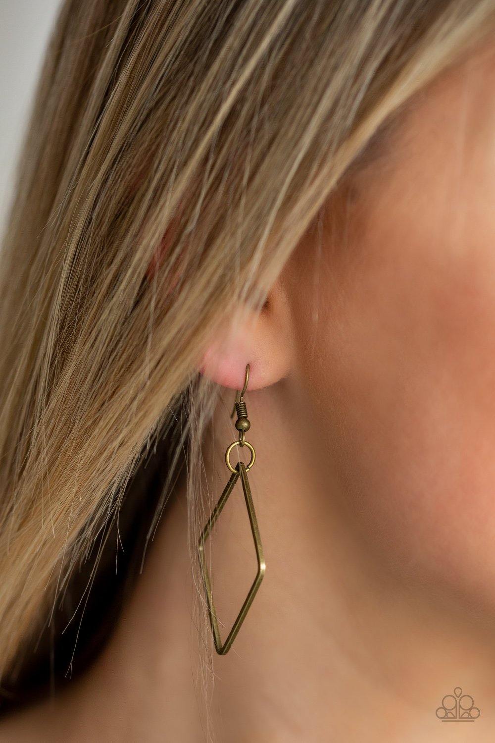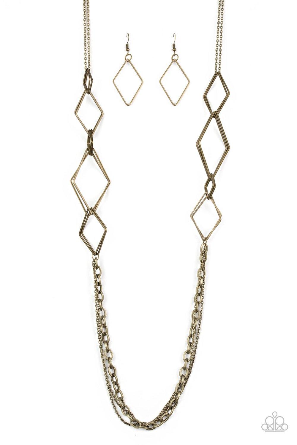A collection of interlocking diamond-shaped frames give way to rows of mismatched brass chains, creating edgy layers across the chest. Features an adjustable clasp closure.