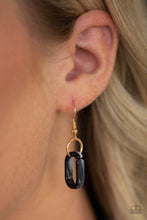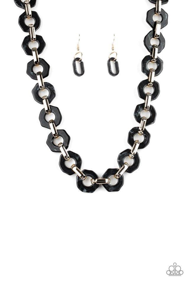 Glistening gold fittings link with black hexagon-like acrylic frames below the collar for a seasonal flair. Features an adjustable clasp closure.