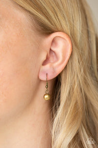 A row of antiqued brass beads gives way to glassy brass teardrops, creating a bold tone on tone fringe below the collar. Features an adjustable clasp closure.