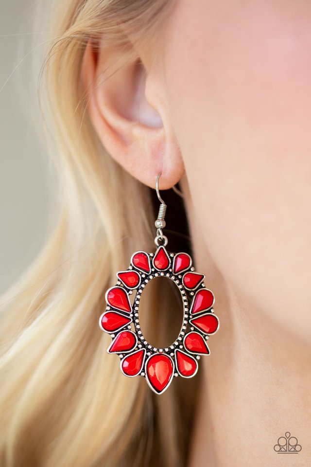 Faceted red teardrops flare from a studded silver hoop, coalescing into a flirty frame. Earring attaches to a standard fishhook fitting.