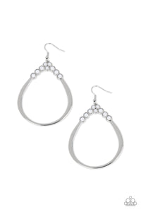 The top of a shiny silver teardrop is dotted in dainty white beads, adding a bubbly pop of color to the ear. Earring attaches to a standard fishhook fitting.