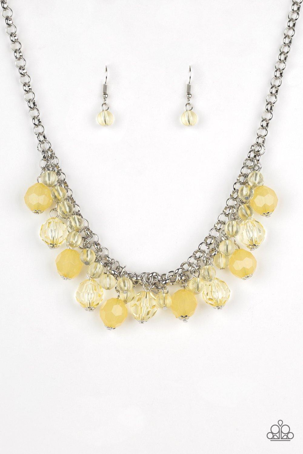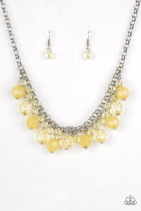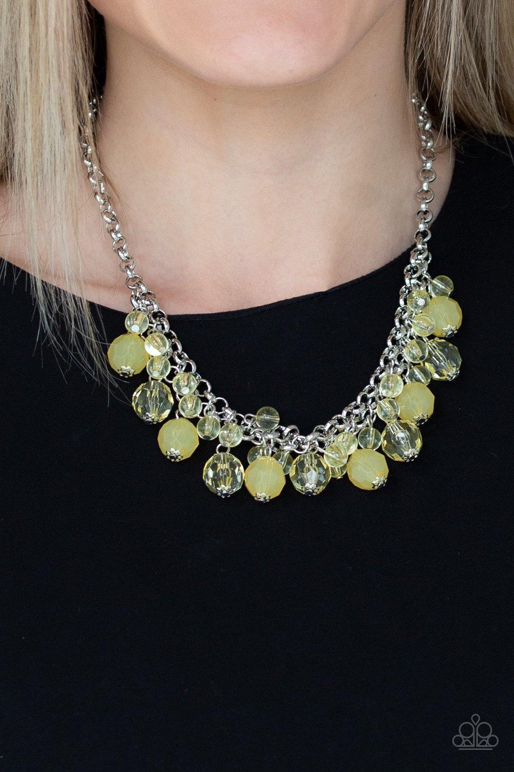A collection of glassy and opaque yellow crystal-like beads swing from the bottom of interlocking silver chains, creating a fabulous fringe below the collar. Features an adjustable clasp closure.