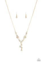 Encased in sleek gold frames, a collection of glittery white rhinestones coalesce into dazzling frames below the collar. Matching rhinestones trickle from the center, creating a glamorous extended pendant. Features an adjustable clasp closure.