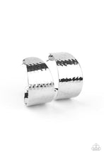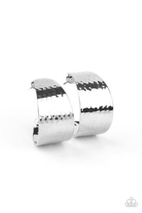 Delicately hammered in a shimmery finish, a flat silver frame curls into a curvy hoop for a chic finish. Earring attaches to a standard post fitting. Hoop measures approximately 1 1/2" in diameter.