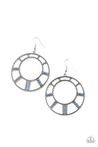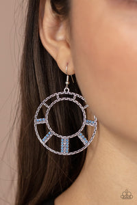 Stacks of dainty French Blue beads flare out from a textured silver frame, creating a colorful sunburst pattern. Earring attaches to a standard fishhook fitting.