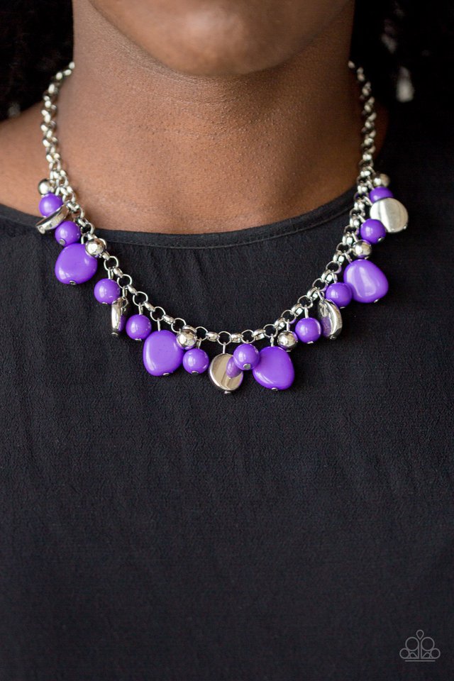 Featuring round and asymmetrical shapes, shiny silver and purple beads swing from the bottom of a bold silver chain, creating a flirtatious fringe below the collar. Features an adjustable clasp closure.