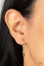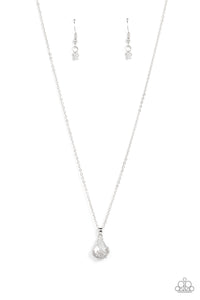 Dainty silver flowers adorn the bottom of a sparkly white teardrop gem at the bottom of a dainty silver chain, creating a prismatic pendant below the collar. Features an adjustable clasp closure.
