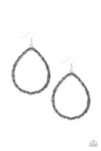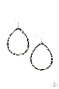Antiqued silver bars weave around dainty black rhinestones, delicately coalescing into a whimsical teardrop frame for a refined look. Earring attaches to a standard fishhook fitting.