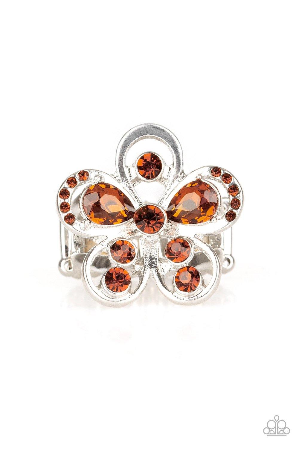 Varying in shape and size, sparkling brown rhinestones are sprinkled along airy silver petals, coalescing into a glittery flower atop the finger. Features a stretchy band for a flexible fit.