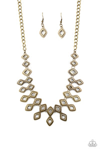 Brushed in an antiqued shimmer, glistening diamond-shaped brass frames link below the collar, coalescing into an edgy geometric fringe. Features an adjustable clasp closure.