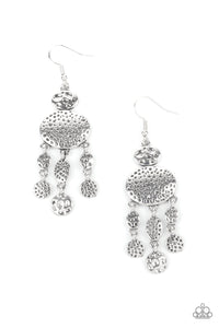 Hammered in mismatched textures, a collision of round and oval silver frames connect into a tasseled lure for an artisan inspired look. Earring attaches to a standard fishhook fitting.