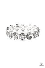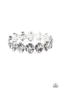 Trios of elegant marquise smoky rhinestones delicately join into leafy silver frames along a stretchy band, creating a refined display around the wrist.