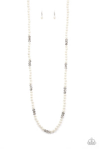 Infused with sections of smoky crystal-like beads, a timeless collection of white pearls are threaded along an invisible wire across the chest for a refined flair. Features an adjustable clasp closure.