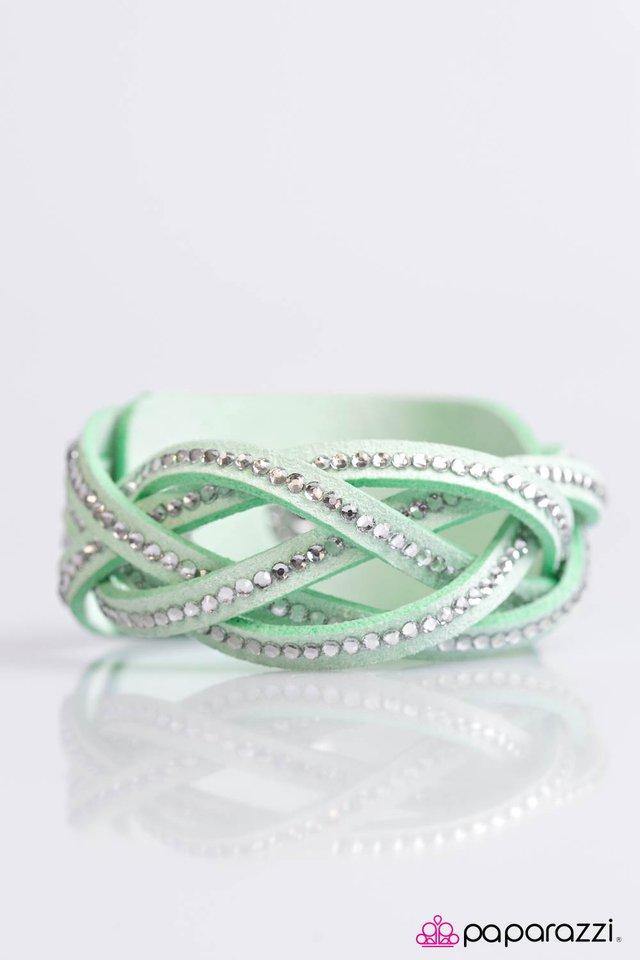 Glassy white rhinestones are sprinkled across interweaving green suede bands, creating a timeless sparkling palette across the wrist. Features an adjustable snap closure.