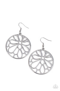 A stenciled silver blossom asymmetrically blooms inside a silver hoop, resulting in a whimsical floral fashion. Earring attaches to a standard fishhook fitting.