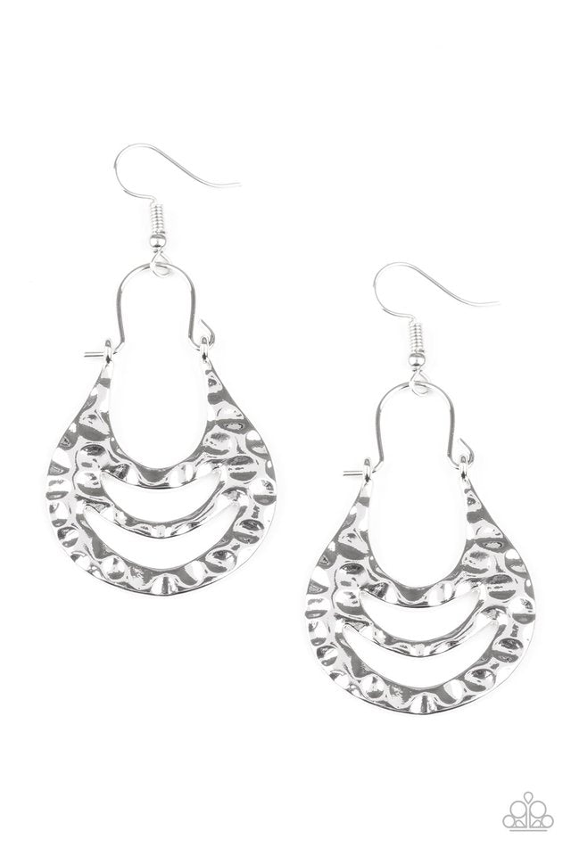 Suspended from a dainty wire fitting, a delicately hammered silver frame ripples from the ear for a handcrafted, artisan inspired look. Earring attaches to a standard fishhook fitting.