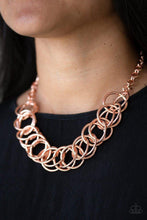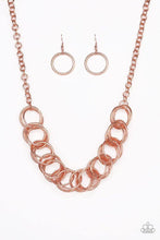 Smooth and serrated copper rings interlock below the collar for a bold statement. Features an adjustable clasp closure. Sold as one individual necklace. Includes one pair of matching earrings.