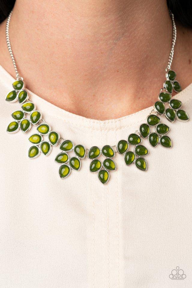Glassy Military Green teardrop beads cluster into leafy frames below the collar, creating a whimsically ethereal fringe. Features an adjustable clasp closure.