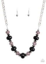 Saucer shaped silver beads trickle between faceted black beads and smoky crystal-like beads along an invisible wire, creating a glamorous display below the collar. Features an adjustable clasp closure.