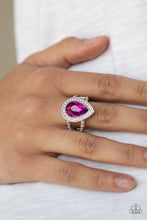 A glassy pink teardrop gem is pressed into a glistening silver frame encrusted in dainty white rhinestones, creating a glamorous frame atop the finger. Features a dainty stretchy band for a flexible fit.