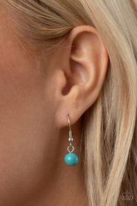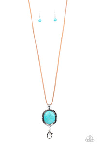 Dotted with an oversized refreshing turquoise stone center, a textured silver frame glides along a piece of brown suede across the chest for an earthy flair. A lobster clasp hangs from the bottom of the design to allow a name badge or other item to be attached. Features an adjustable clasp closure.